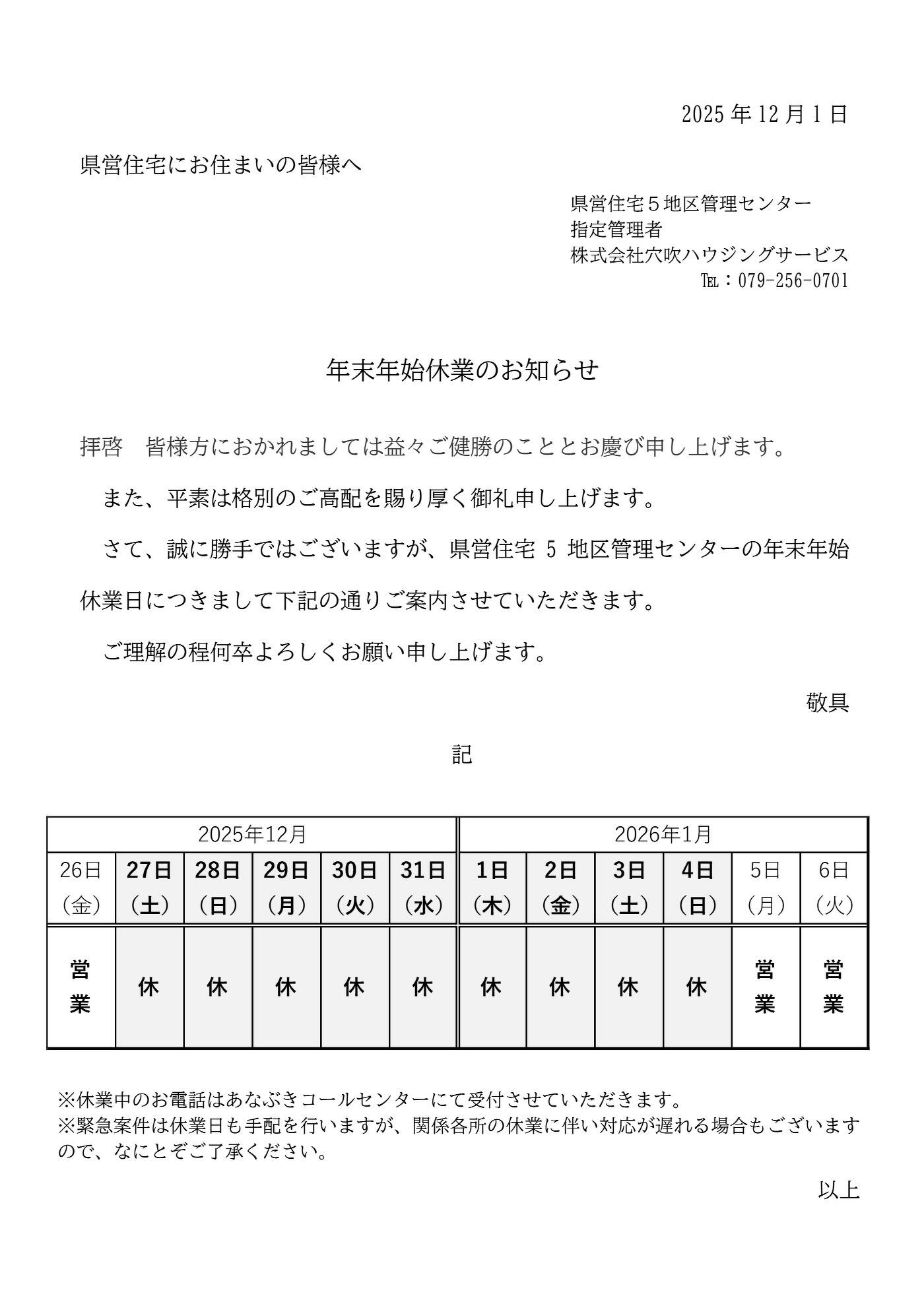 年末年始休業のお知らせ